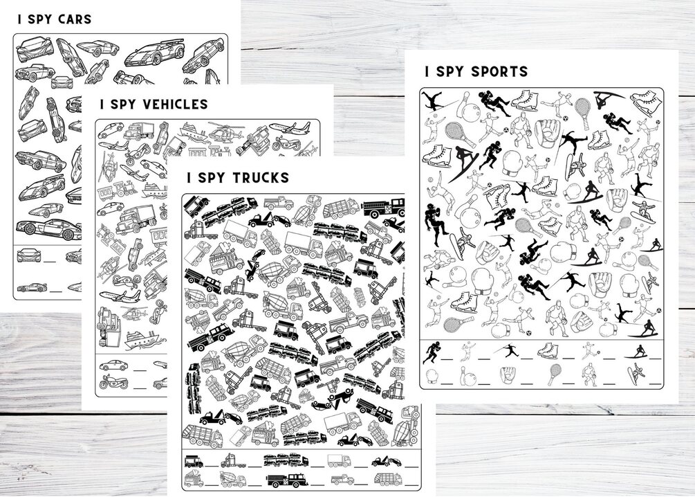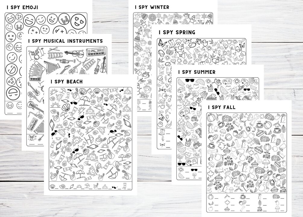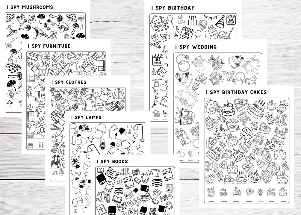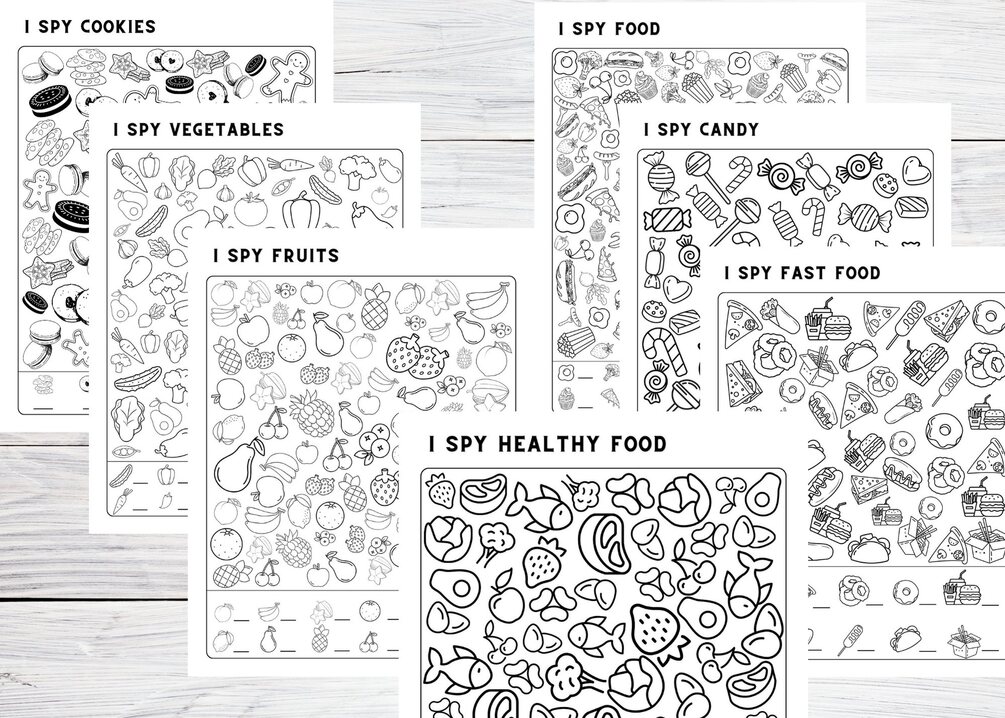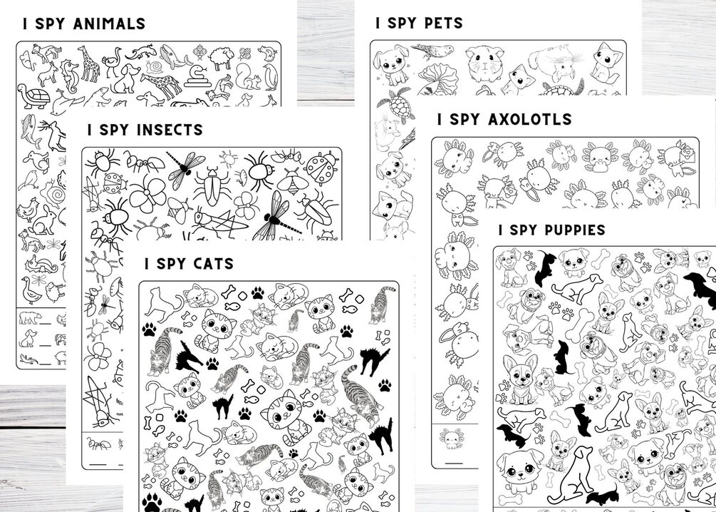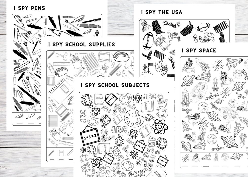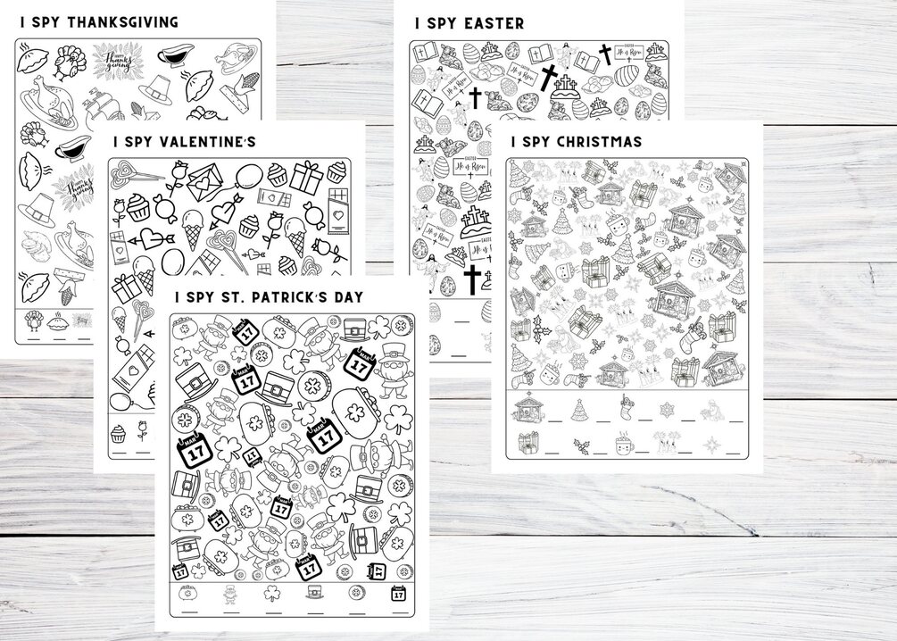 Printable 42 I SPY pages for kids activities for trips - Holidays, Food, Pets, Axolotls, the USA, Christmas, Easter, St. Patrick's, Sports; Kindergarten, Preschool, Elementary school kids worksheets for fun at home.