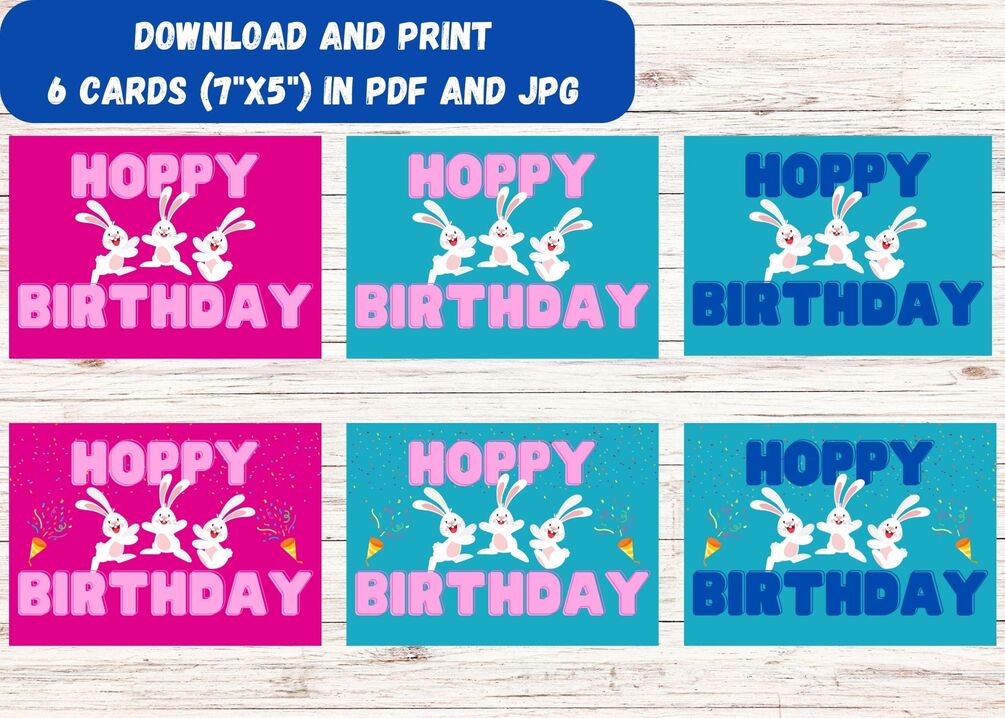 Three hopping bunnies are bound to make a leap year birthday more fun. Download and print at your convenience. You'll get three color options, each with or without confetti - a total of 6 styles. Print the one(s) you like and enjoy! The size is 7"x5".